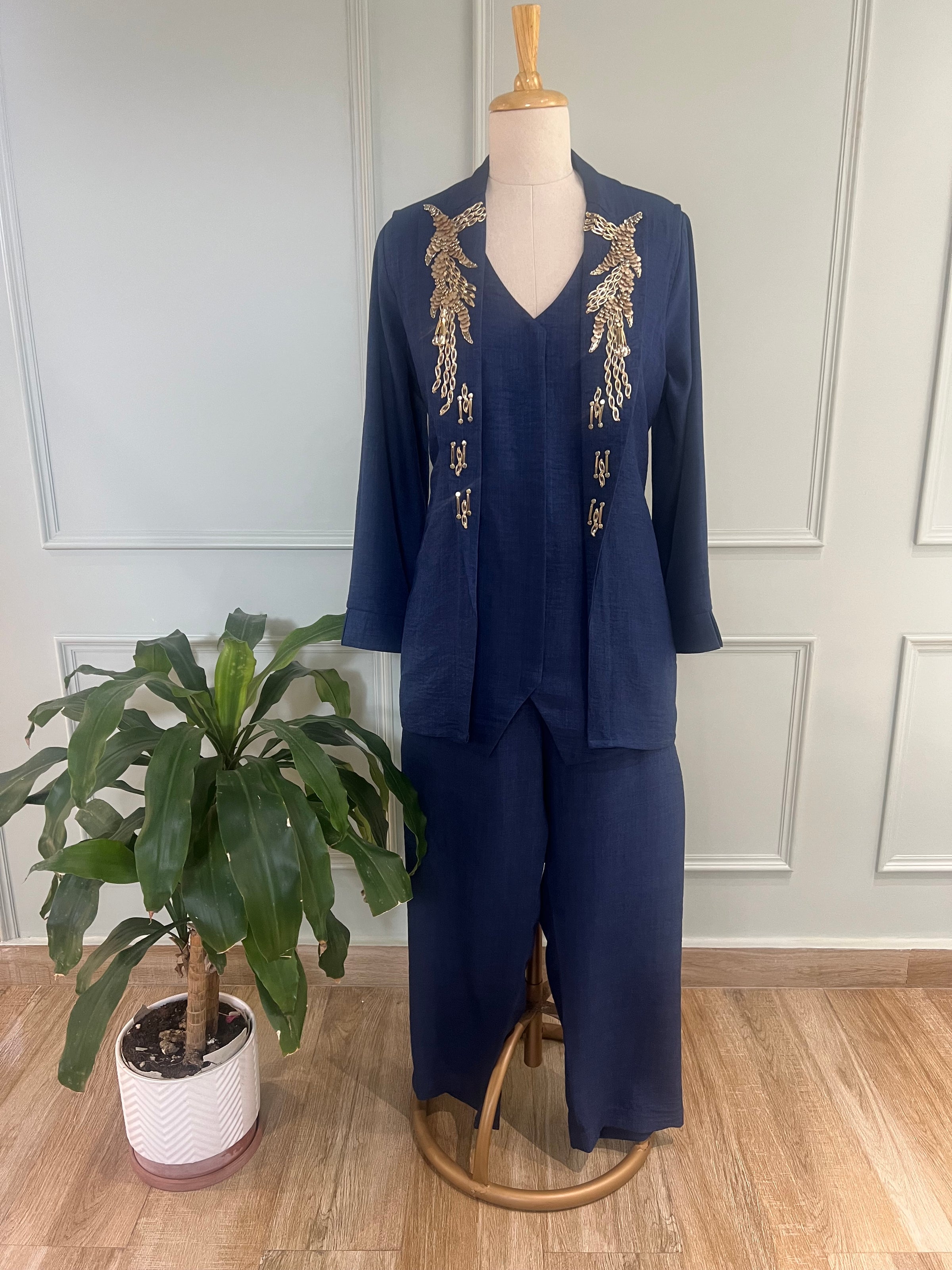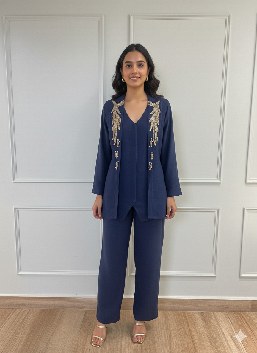 Step out in sophisticated style with our Azure Embroidered Co-ord Set, a testament to modern elegance and refined craftsmanship. This stunning two-piece ensemble features a beautifully tailored v-neck top and relaxed-fit trousers, both in a timeless azure blue. The true highlight is the exquisite gold embroidery, intricately detailed in a leaf-like pattern, adorning the front of the accompanying long-sleeved jacket.